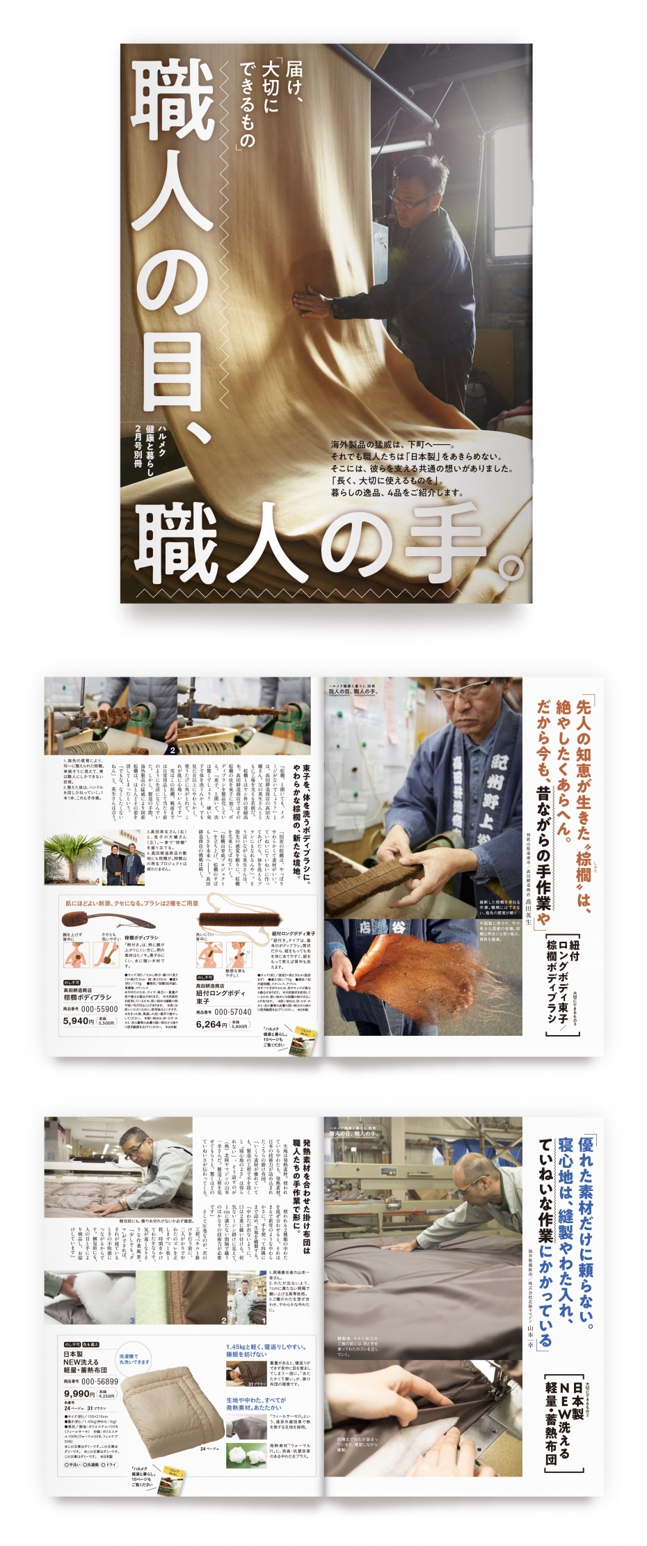 月刊通販カタログの正月特集別冊のデザインを担当しました。職人の現場写真を表紙に使いたいとのオーダでした。いただいた写真があまり表紙向きの写真ではなかったので正直うまくいくのかどうか悩みましたが、デザインした結果なんとも綺麗な写真に見えてきました。売り上げも上々でその後2弾3弾と続きました。CL:ハルメク株式会社