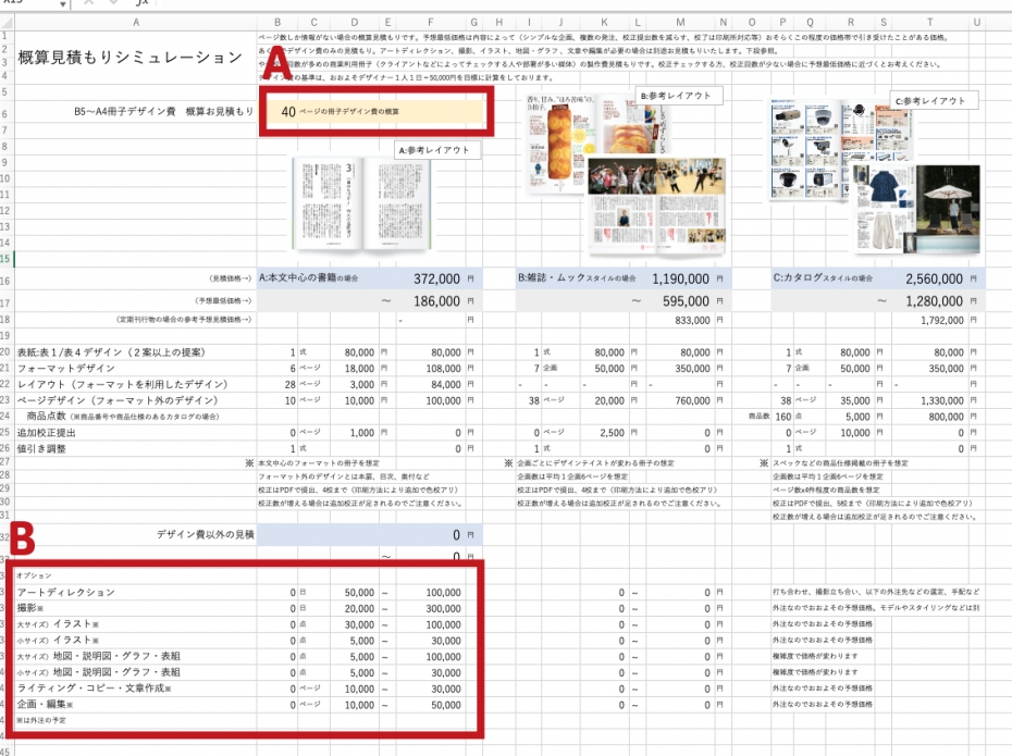 このページをご覧になっているということは、エディトリアルデザイン のデザイン料金について知りたいということだと思います。あくまで概算ですが当社の大体の見積もり感覚がわかるエクセルファイルを作りました。