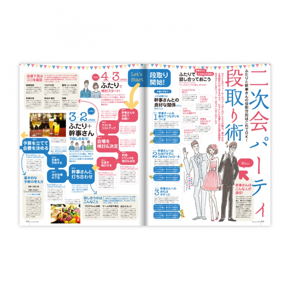 結婚式の2次会の段取りをフローチャート風に追って流れを説明したデザインです。要素が多く複雑なレイアウトになりましたが赤と青のフローチャートを中心に第一に目に入るように工夫したので、複雑なのにあまり混乱せず読める誌面になりました。