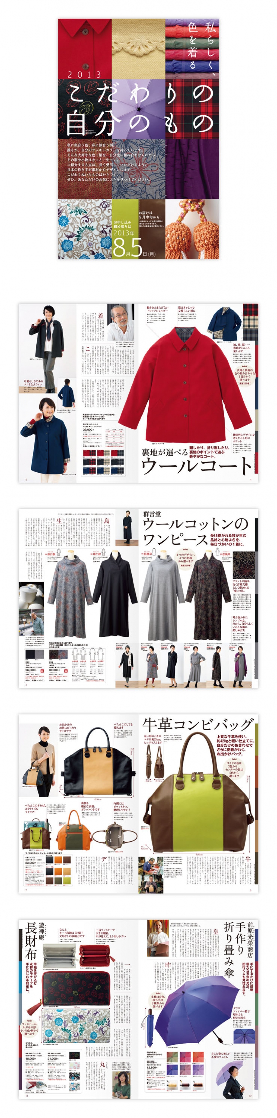 日本の職人が作り出す、ちょっと高級な日用品を集めた通販カタログ。選べる色が豊富だというのが今回の商品の売りだったのでカラフルな細部にズームアップした写真をコラージュした表紙になりました。CL:いきいき株式会社