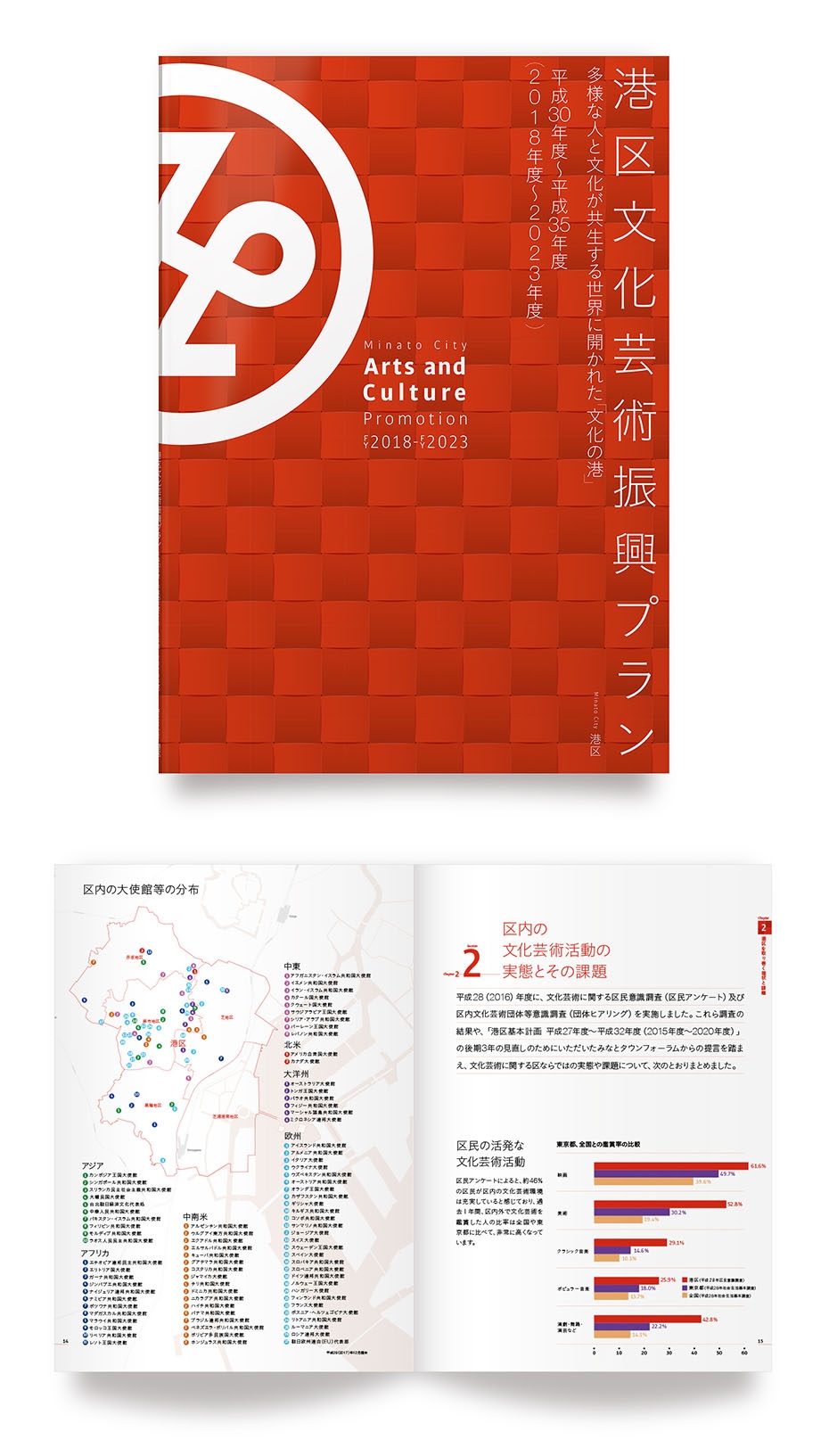 港区の向こう5年間の文化芸術振興プランの冊子をデザインしました。プラン全体に「和」を強く意識していたので市松模様をモチーフに、不思議な形でなかなか格好良い港区の区章を大きく大胆にあしらって表紙にしました。