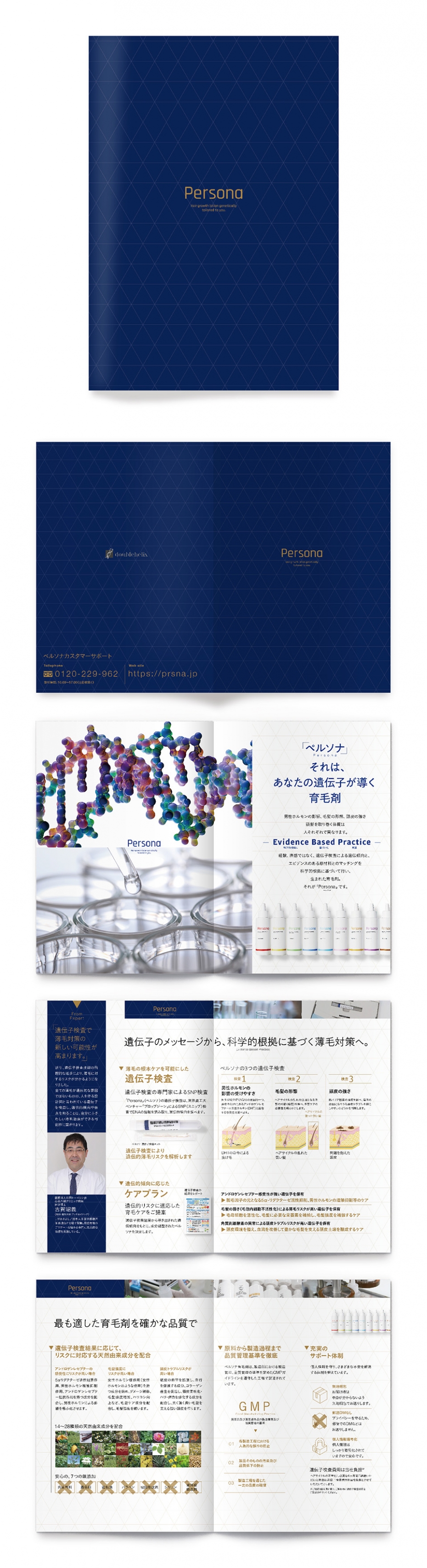通販育毛剤のブランドブック。遺伝子検査からユーザーに合わせた育毛剤をお届けするというコンセプトより、清潔感があるサイエンスの匂いのする表現を心がけました。